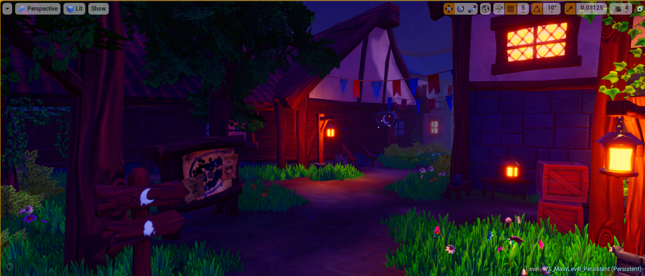 The game's environment was a lived in, forest adjacent village. We used fog and an abundance of natural elements to really help emphasize the town's history and location. It allowed our lighting to be even more dynamic against the nighttime backdrop and the guards to be even more visually present.
